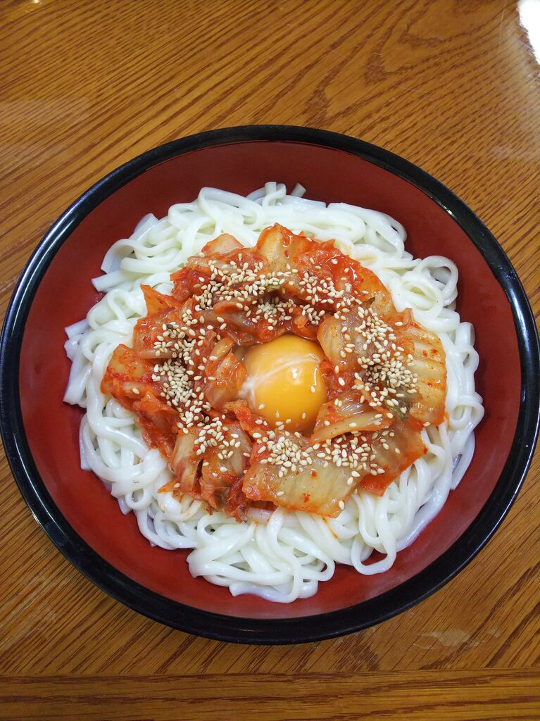 328 キムチ釜玉うどん 冷やしキムチ釜玉うどん 家飲みのお品書き